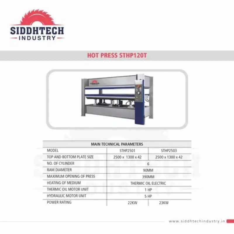 We Are Manufacturing Automatic Hot Press Machine 120 Ton In Ahmedabad, Offering Strong Performance And Durability For Wood-based Industries. This Unit Is Widely Used For Laminating Plywood, MDF Boards, Veneers, And Other Pressing Applications Requiring Stable Heat And Pressure Balance.Main HighlightsHeavy-Duty Construction Built With Precision Steel Frames And Hydraulic Systems That Ensure Long Operational Life And Uniform Pressing Results.Temperature & Pressure Control Automatic Reg Continue