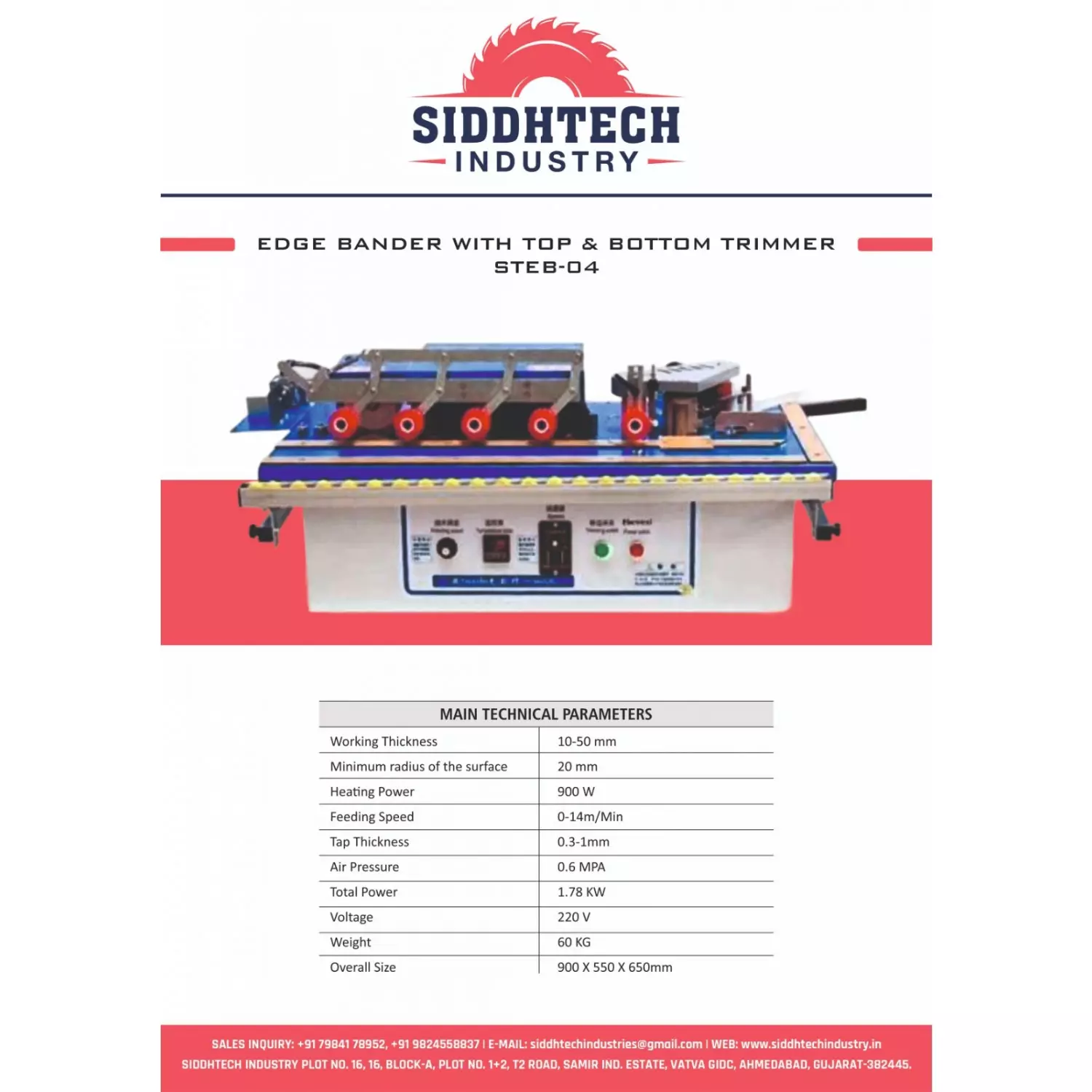 Power Supply: 230V / 50HzFeed Speed: 5–9 m/min (adjustable)Glue Pot Capacity: 1.5–2.0 kgThickness Range: 10–60 mmBanding Tape Width: 0.4 to 3 mmFunctions: Pre-heating, Gluing, End Cutting